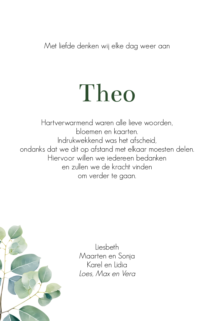 Bedankkaartje na overlijden botanisch met eucalyptus
