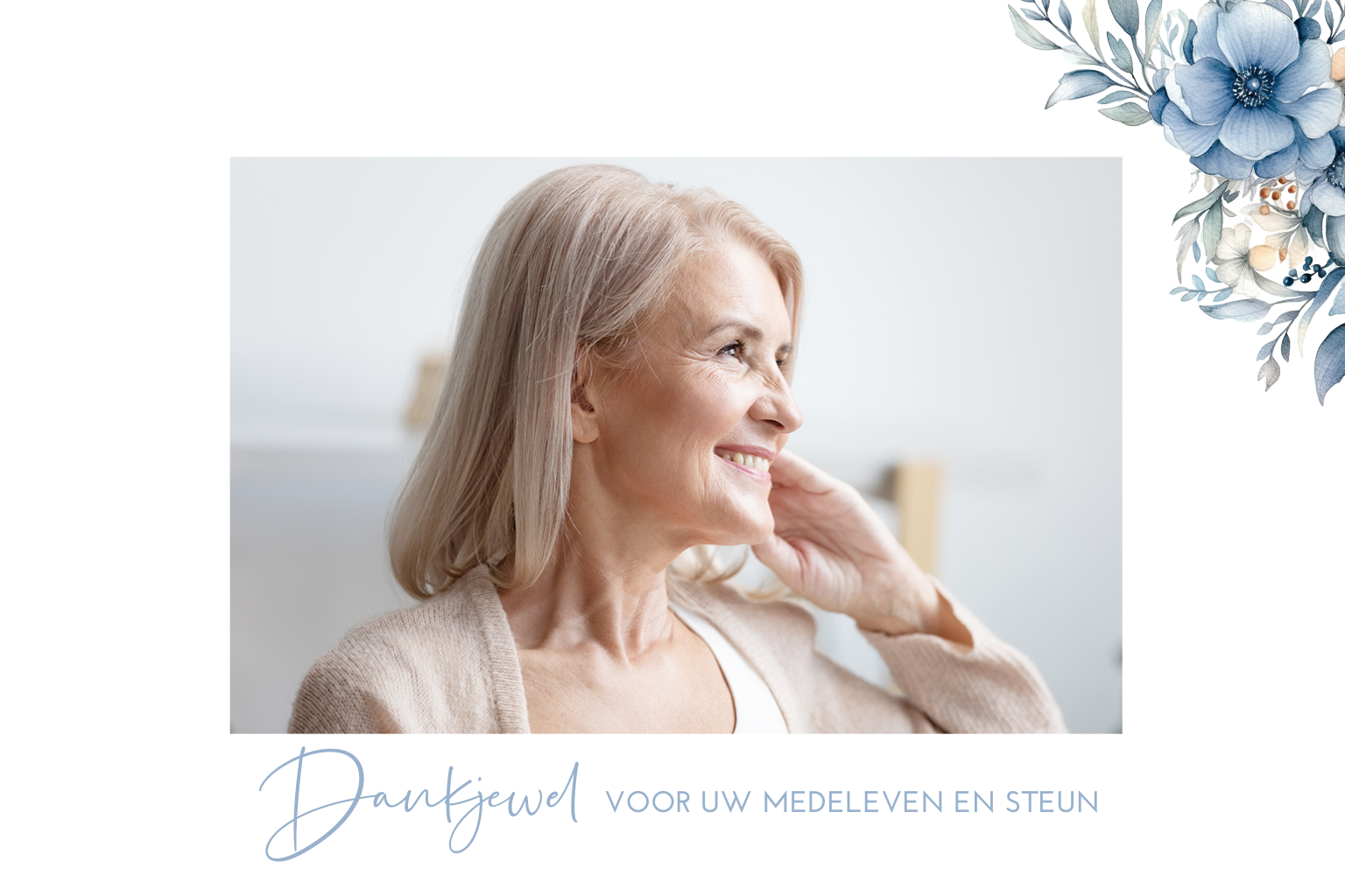 Bedankkaart na overlijden met bloemen in blauwtinten