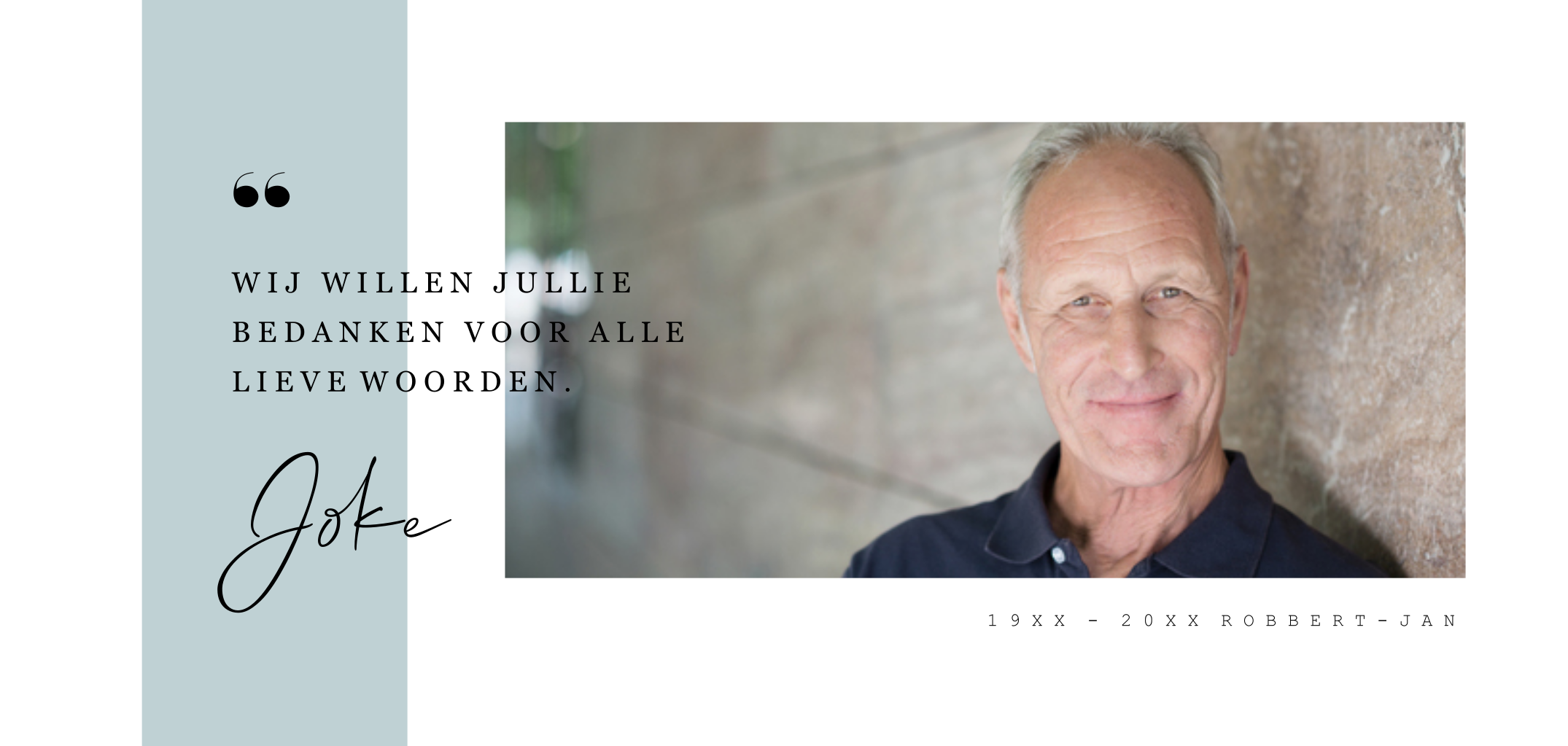 Vervang de foto op deze bedankkaarten na overlijden eenvoudig door jullie eigen foto. En maak de kaart persoonlijk met een eigen quote.