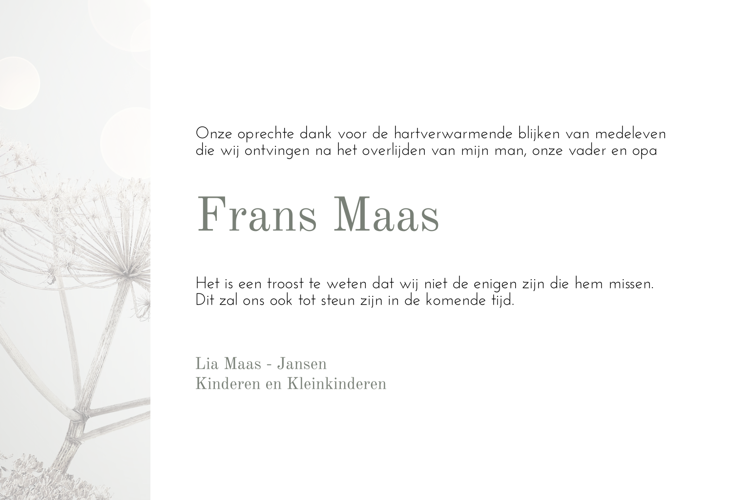 Bedank vrienden en familieleden voor alle steun na het overlijden van jullie dierbare met een officiële bedankkaart. Een klein gebaar van grote waarde. Deze bedankkaart is opgemaakt met een foto van een berenklauw en een schreeflettertype.