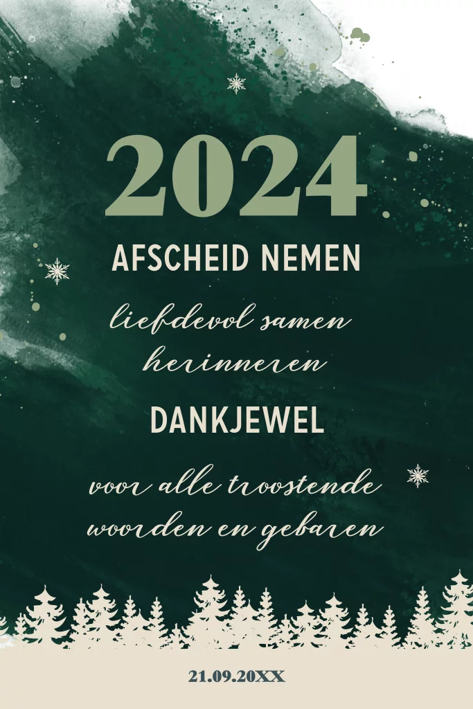 Maak een mooie dankbetuiging na overlijden die past bij het seizoen. Wij hebben gekozen voor een winterlandschap en mooie woorden gecombineerd met een kerstwens.