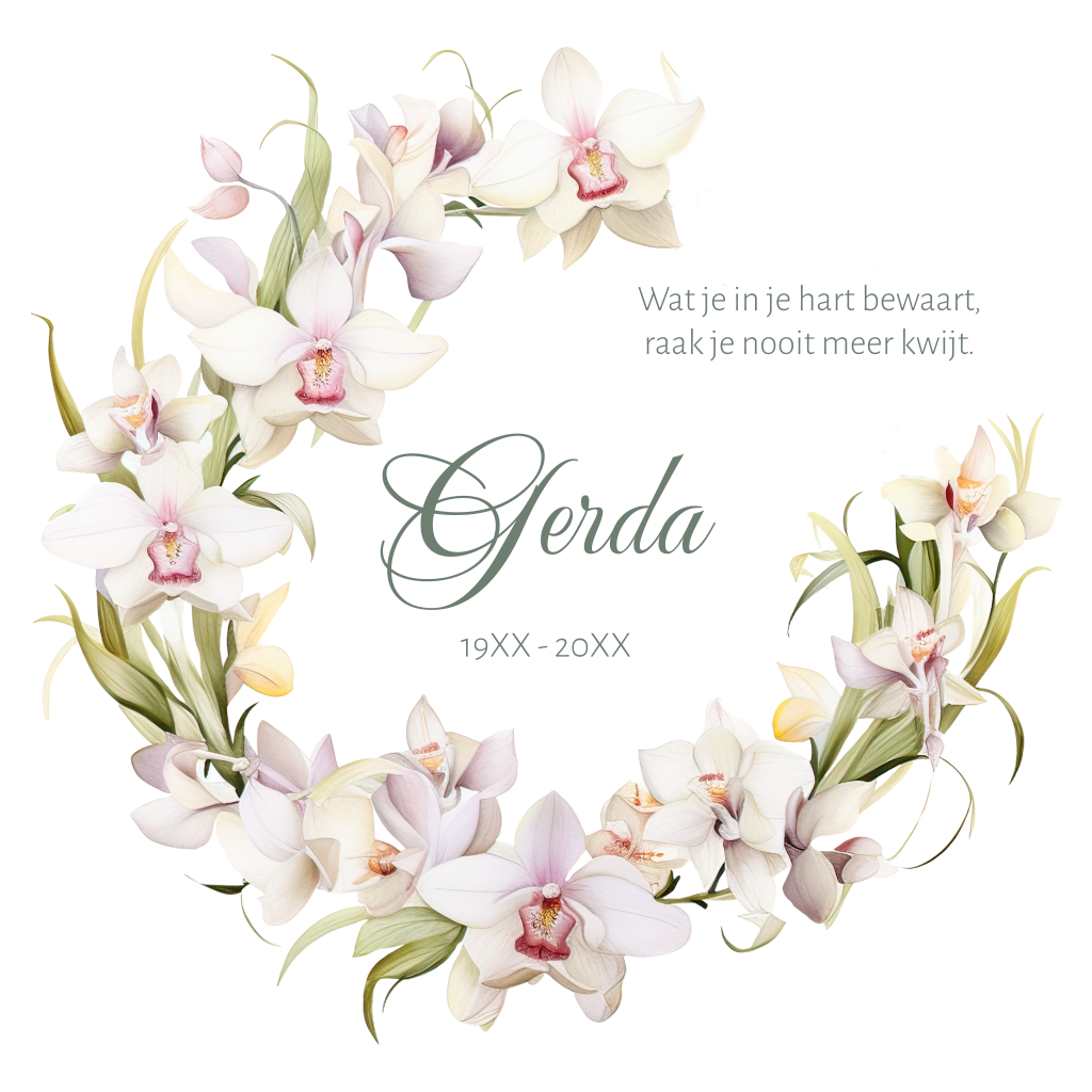 Deze bedankkaart na overlijden is ontworpen met een prachtige illustratie van een orchidee. Aan de binnenzijde is ruimte voor een persoonlijke foto.