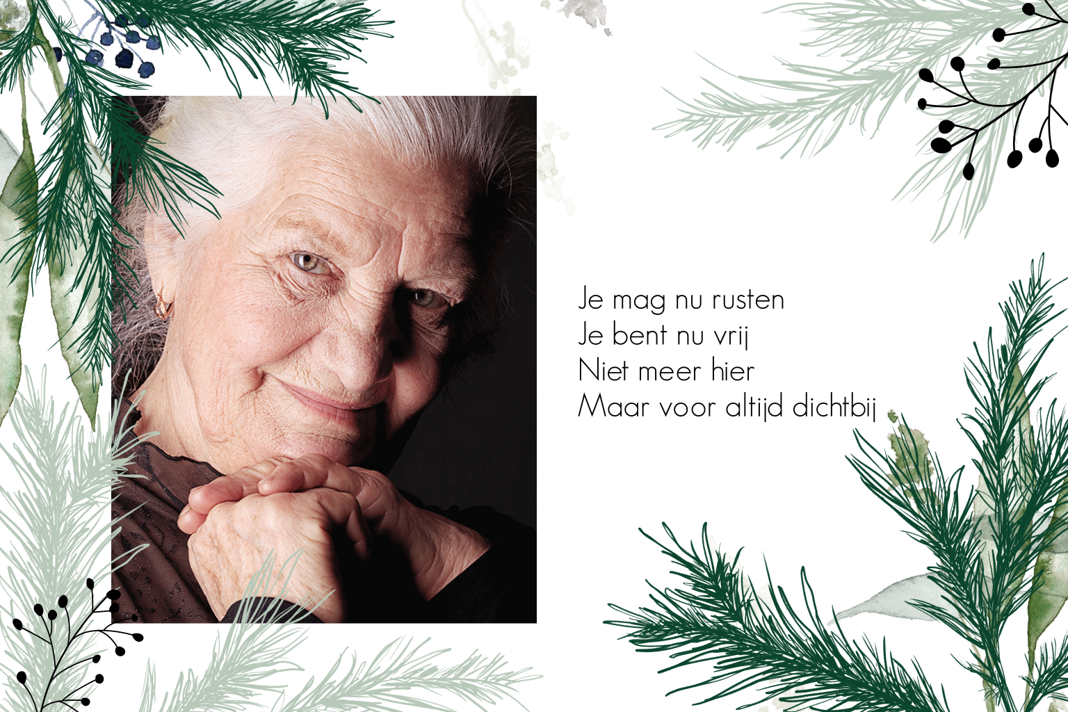 Een kaart om te bedanken na overlijden is een mooi gebaar van grote waarde. Deze bedankkaart is ontworpen in het thema kerst. Een mooi moment om dierbaren te bedanken in een periode van samenzijn en elkaar gezondheid wensen.