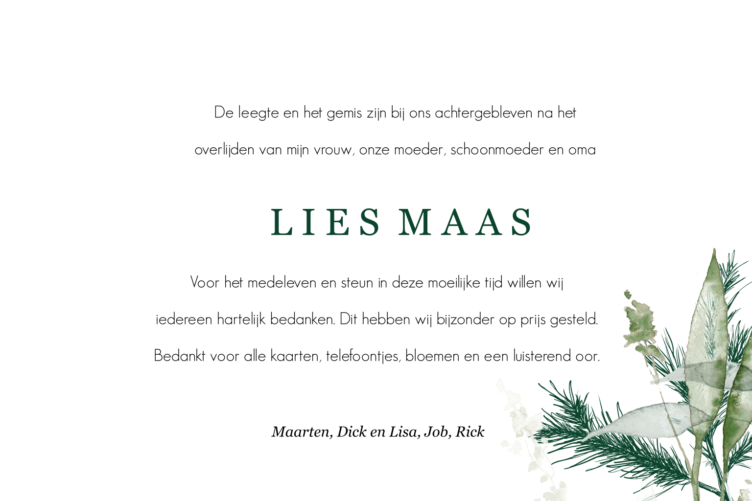 Willen jullie graag een bedankkaart sturen in stijl van de rouwkaart, maar staat deze er niet tussen? We zetten graag een doorvertaling van jullie kaart klaar in je eigen collectie.