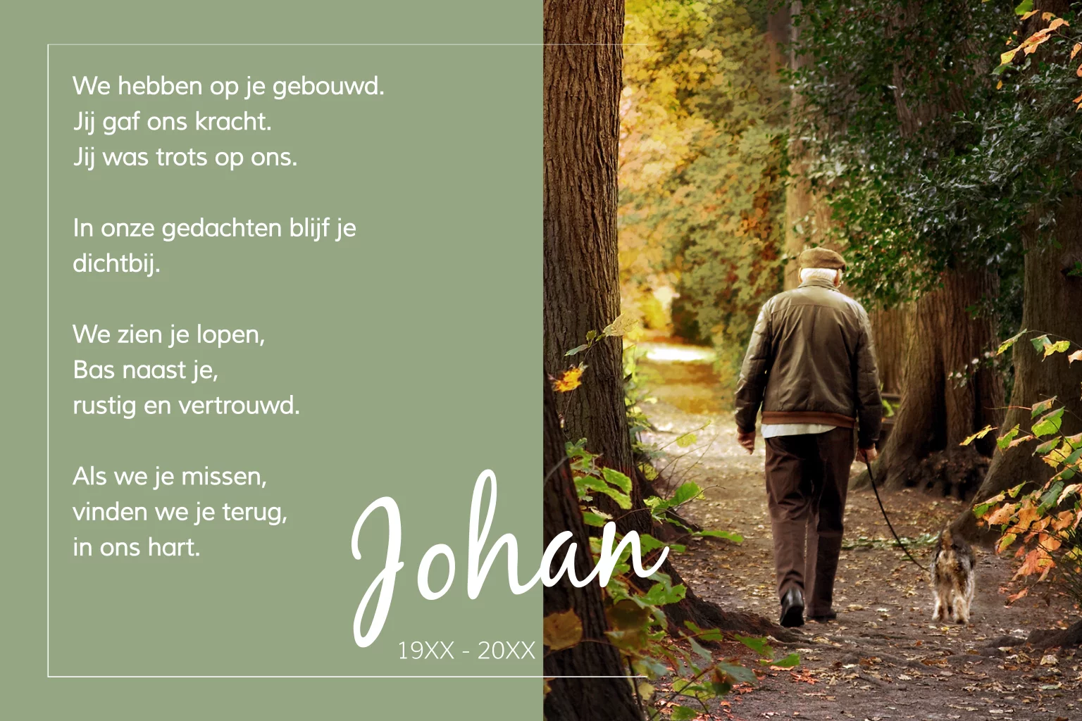 Een passende bedankkaart bij de gekozen rouwkaart. Pas de kleur gemakkelijk aan naar een kleur die mooi bij de foto past.