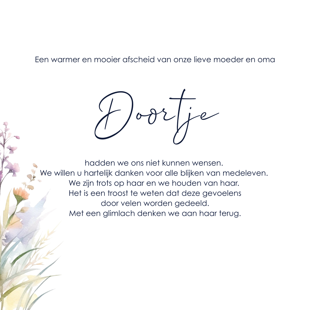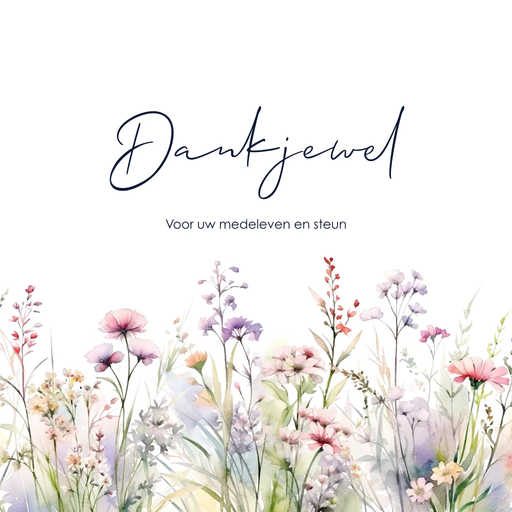 Een liefdevol gebaar. Bedankkaarten na overlijden sturen naar familie en vrienden. Kies voor dit mooie ontwerp met veldbloemen.