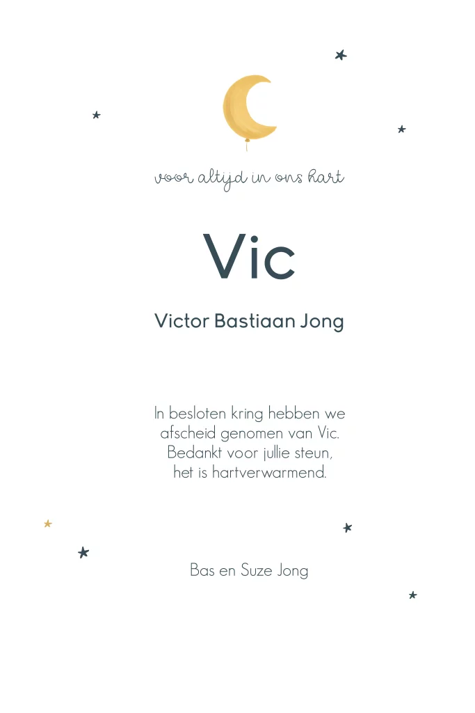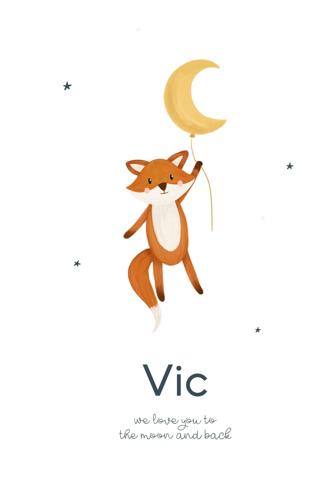 Een rouwkaartje maken voor een sterrenkind? Kies dit ontwerp met vosje en maanballon en ontwerp een mooie herinnering aan jullie zoontje.