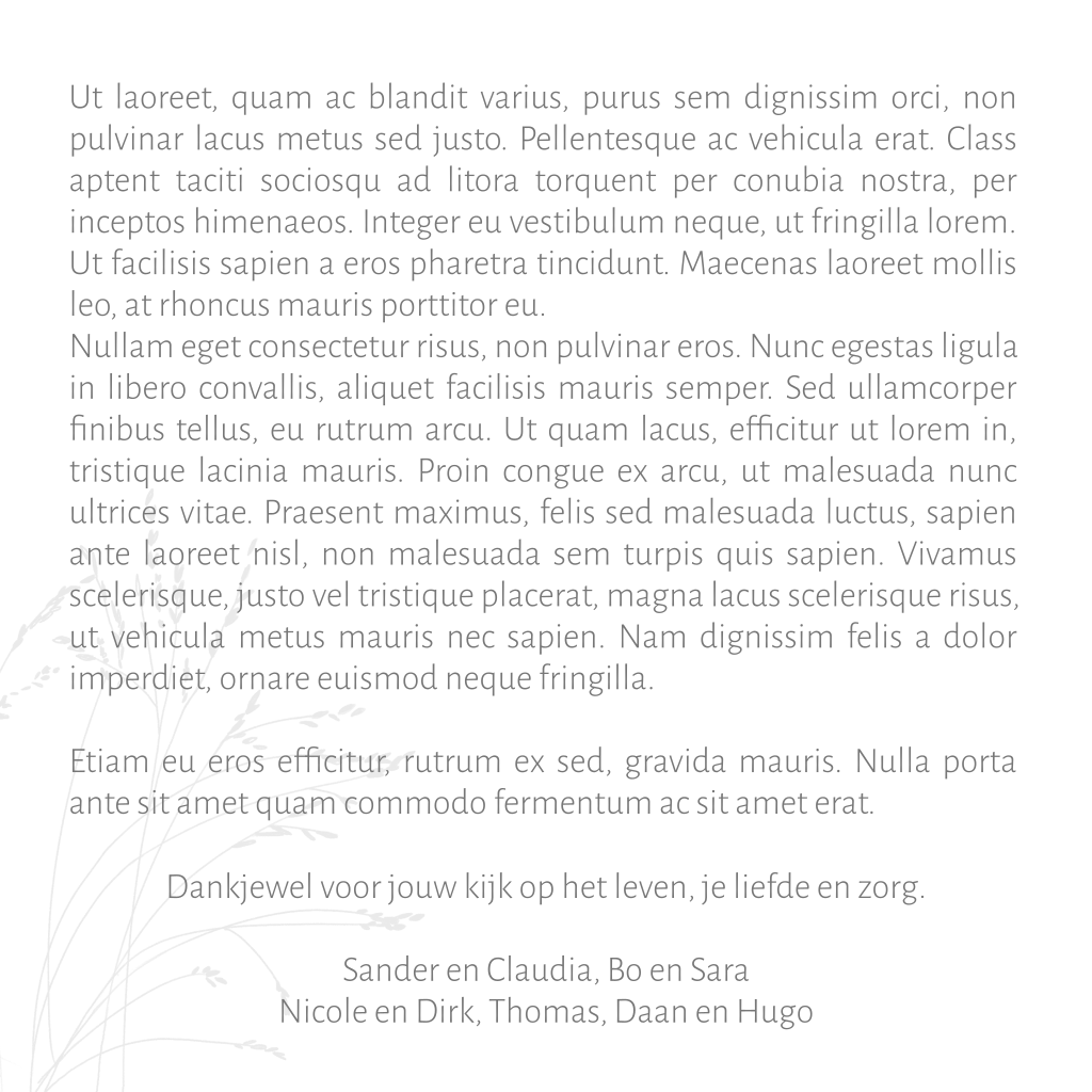 Vervang eenvoudig de foto en pas de tekst in de editor aan. Schrijf het In Memoriam en gebruik ongeveer 1850 karakters.