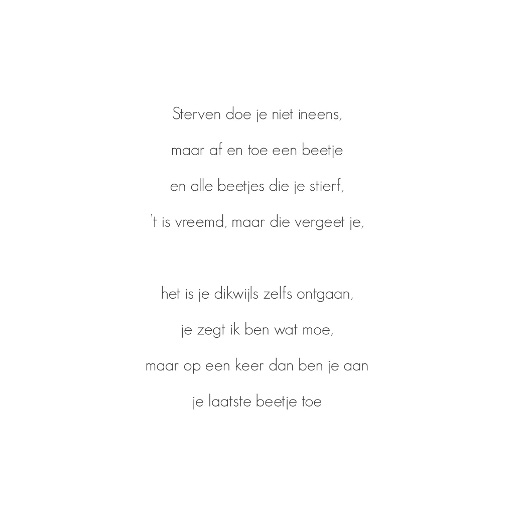 Maak een persoonlijk bidprentje. Een mooi kaartje om de overledene te herinneren. Aan de binnenzijde is gewerkt met een gedicht van Toon Hermans.
