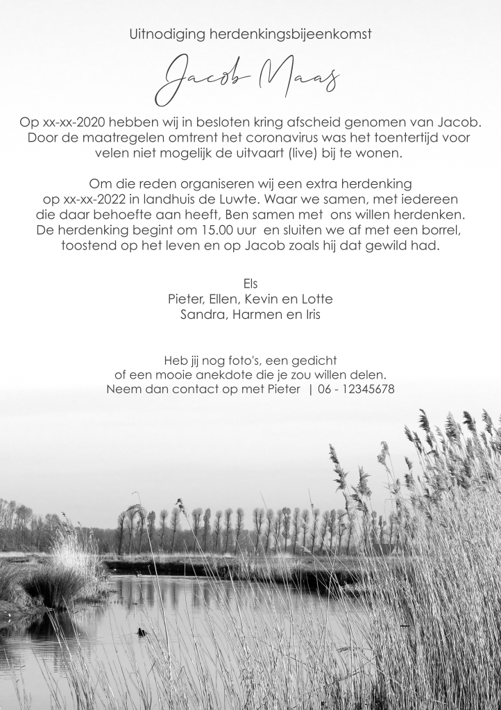 Nodig met deze bijzondere kaart naasten uit voor een uitgestelde herdenking. Maak de kaart persoonlijk door zelf een stukje tekst of gedichtje toe te voegen.