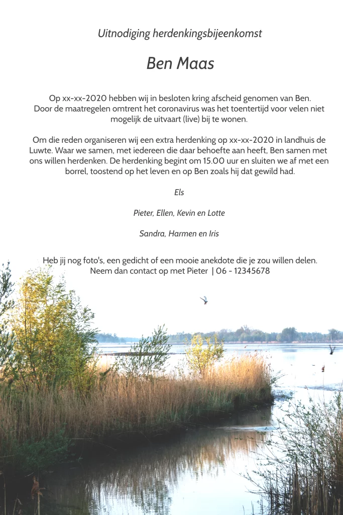 Nodig met deze bijzondere kaart naasten uit voor een uitgestelde herdenking. Maak de kaart persoonlijk door zelf een stukje tekst of gedichtje toe te voegen.