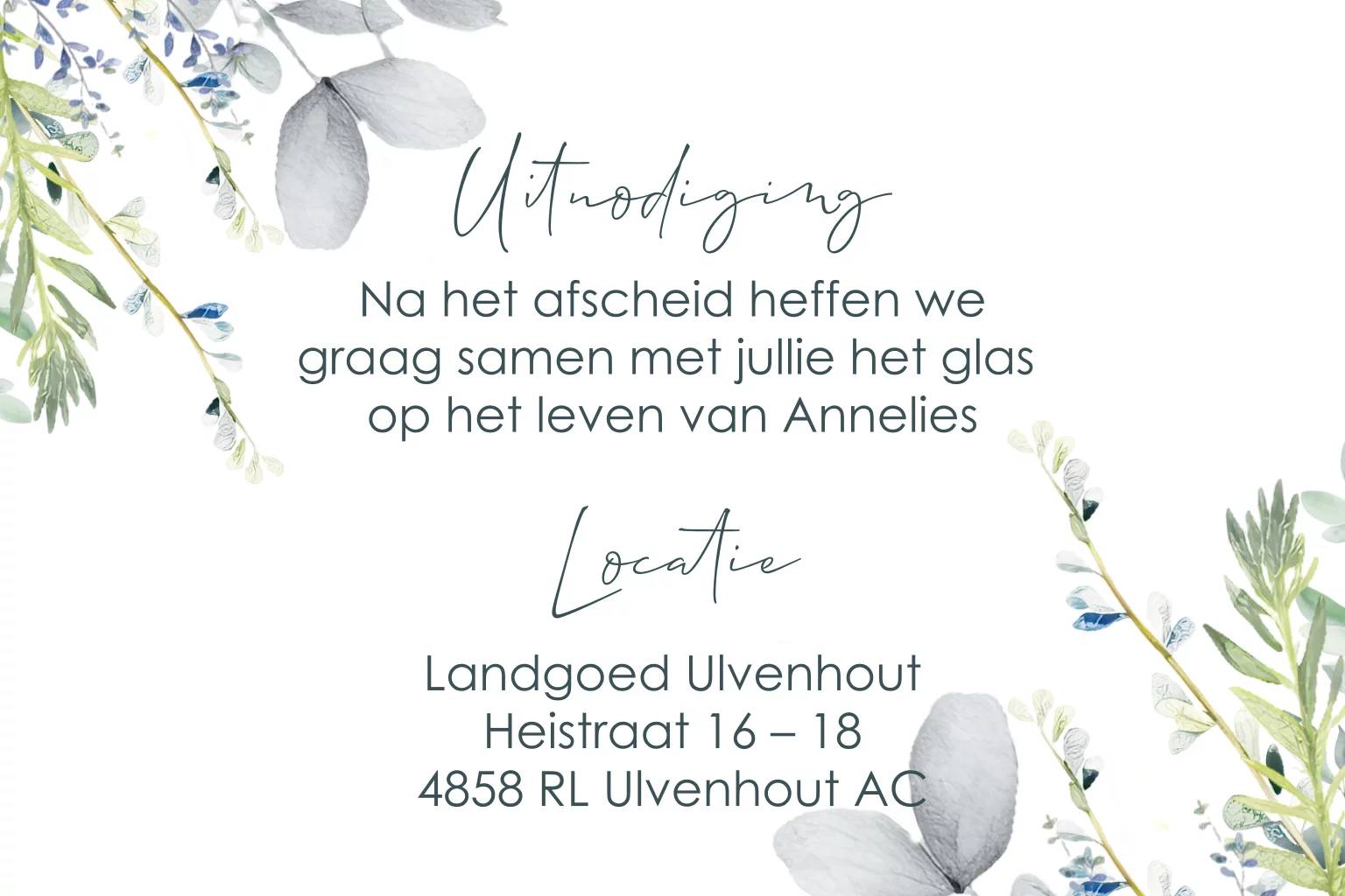 In stijl van de kaart kun je ook een klein kaartje toevoegen om familie en vrienden uit te nodigen voor een samenzijn na het afscheid.