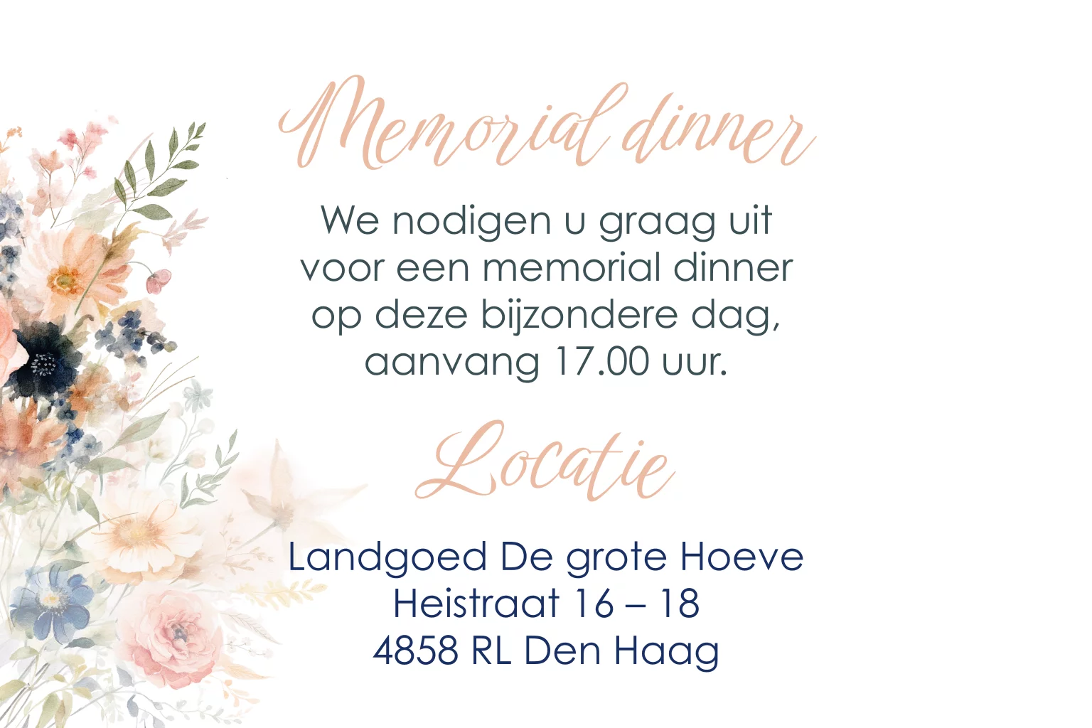 In stijl van de kaart kun je ook een klein kaartje toevoegen om familie en vrienden uit te nodigen voor een samenzijn na het afscheid.
