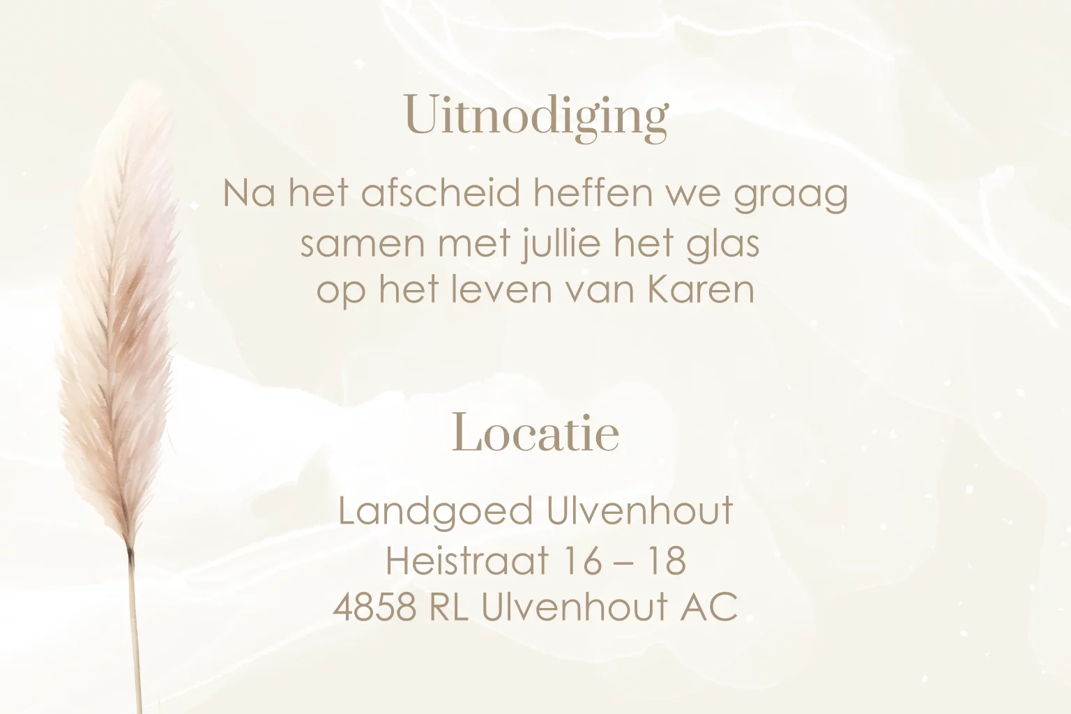 In stijl van de kaart kun je ook een klein kaartje toevoegen om familie en vrienden uit te nodigen voor een samenzijn na het afscheid.