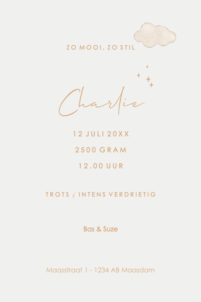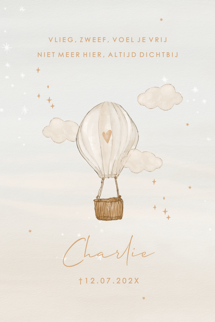 Kies voor dit lieve baby rouwkaartje met luchtballon, sterren en wolkjes. Deel de geboorte en het overlijden van jullie kleintje met dit kaartje.