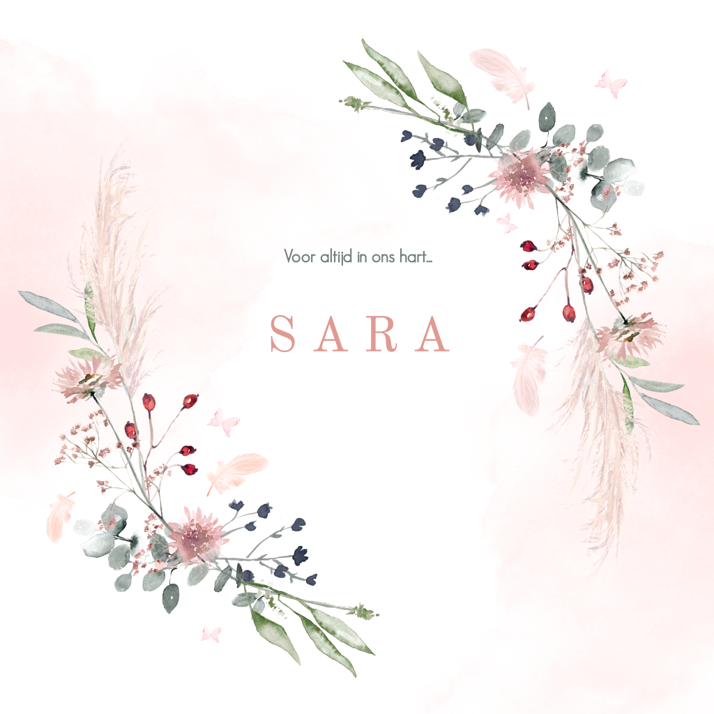 Kies voor dit lieve rouwkaartje kind met veldbloemen als een krans om haar naam, kleine vlindertjes en dwarrelende veertjes.