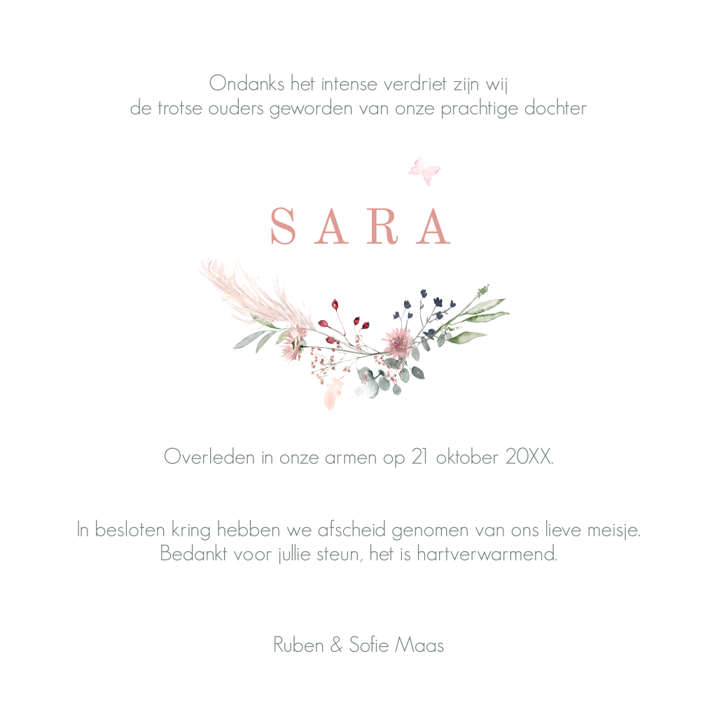 Baby rouwkaartje met veldbloemen in krans om haar naam