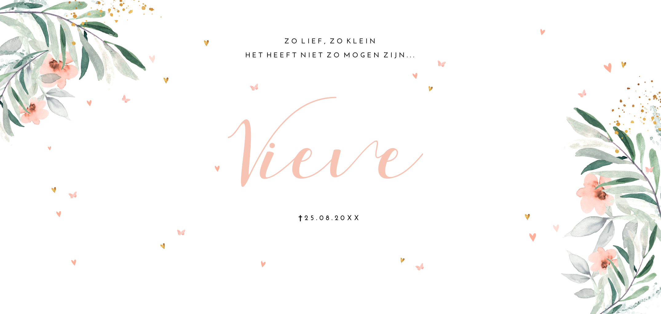 Een lief rouwkaartje met bloemen, vlinders en hartjes om de geboorte en het overlijden van jullie meisje aan te geven.