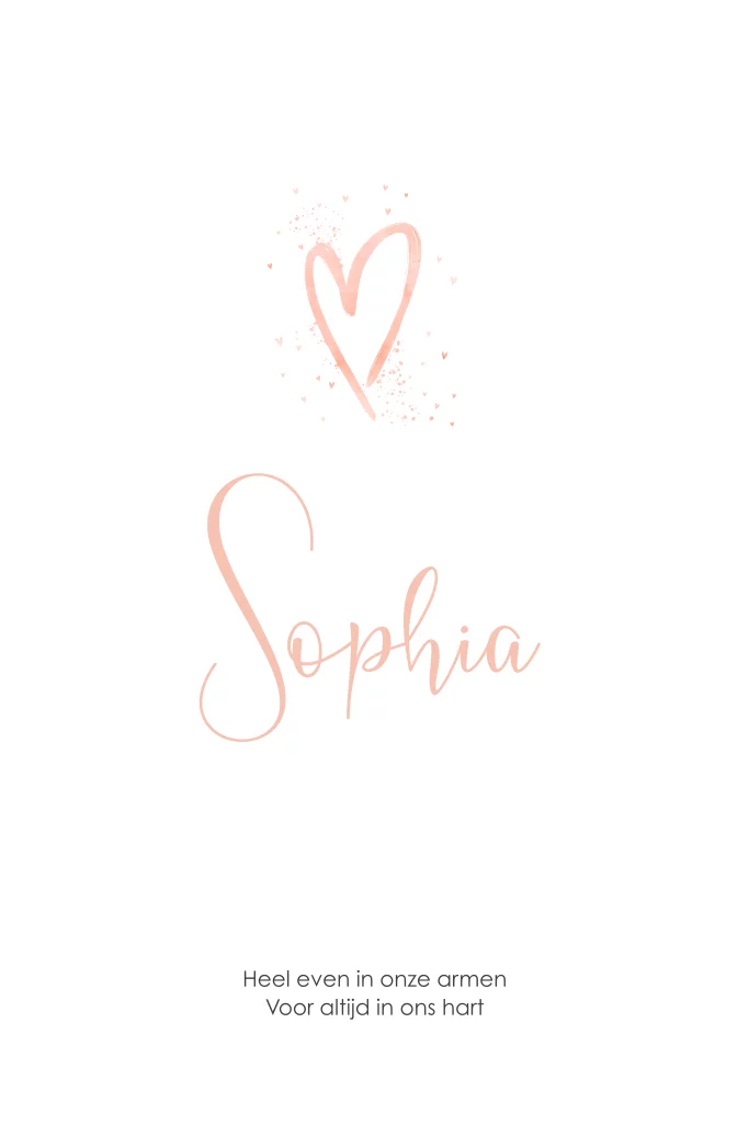 Rouwkaart voor een baby meisje met een hartje in de kleur peach. De tekst is geheel naar jullie wens aanpasbaar.
