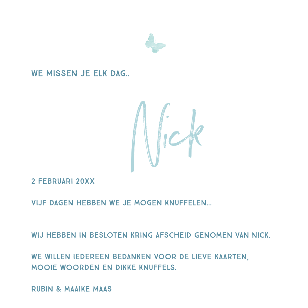 De vlinder, het hart van wolken en de zachte kleuren geven de rouwkaart een sfeervolle uitstraling.