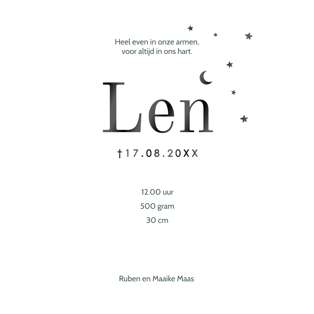 Maak samen een persoonlijk rouwkaartje voor jullie baby. Deel met vrienden de geboorte en het overlijden van jullie zoon - speciaal met folie.