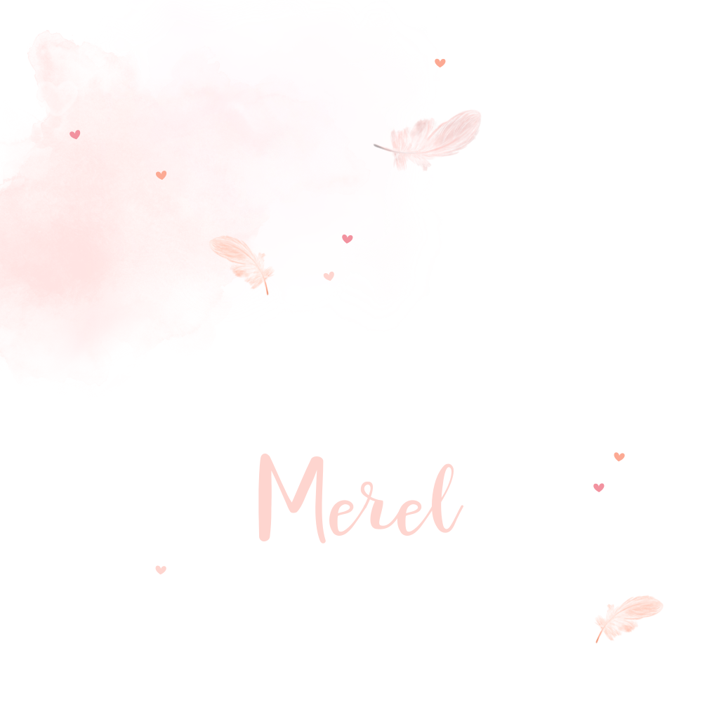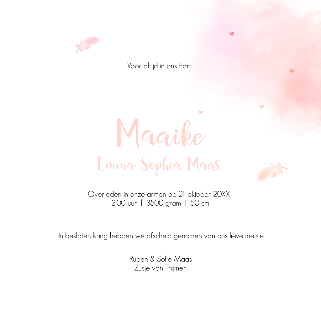 Rouwkaart baby meisje met subtiele kleuren, veertjes en hartjes. Ruimte voor een mooie tekst op deze kaart om afscheid te nemen.