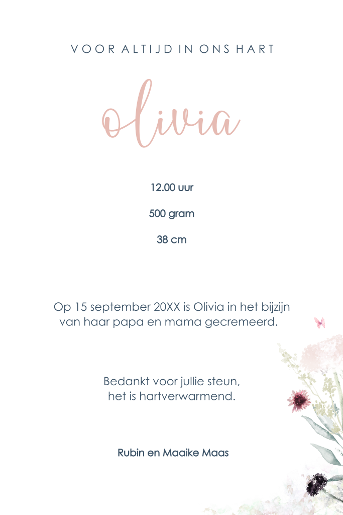 Een prachtig en lief kaartje om de geboorte en het overlijden aan te geven van jullie meisje.
