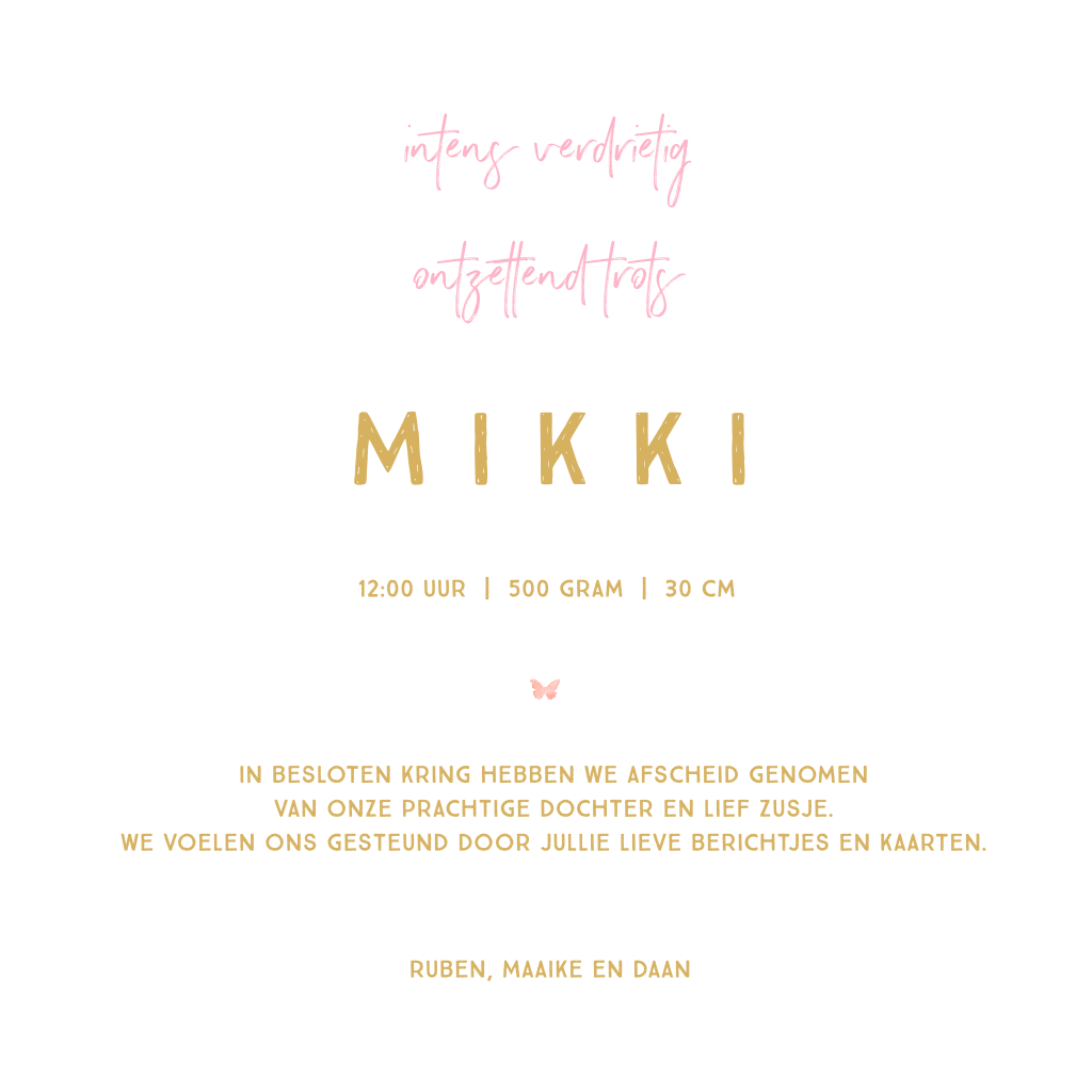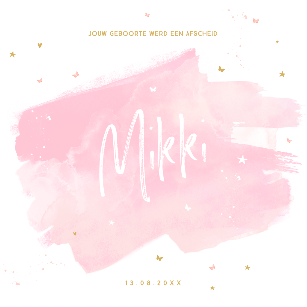 Lief klein kaartje van groot verdriet. We hebben gewerkt met watercolour, kleine hartjes en vlindertjes. Deel de geboorte en het afscheid met familie en vrienden. Maak daarom online een kaartje om te herinneren.