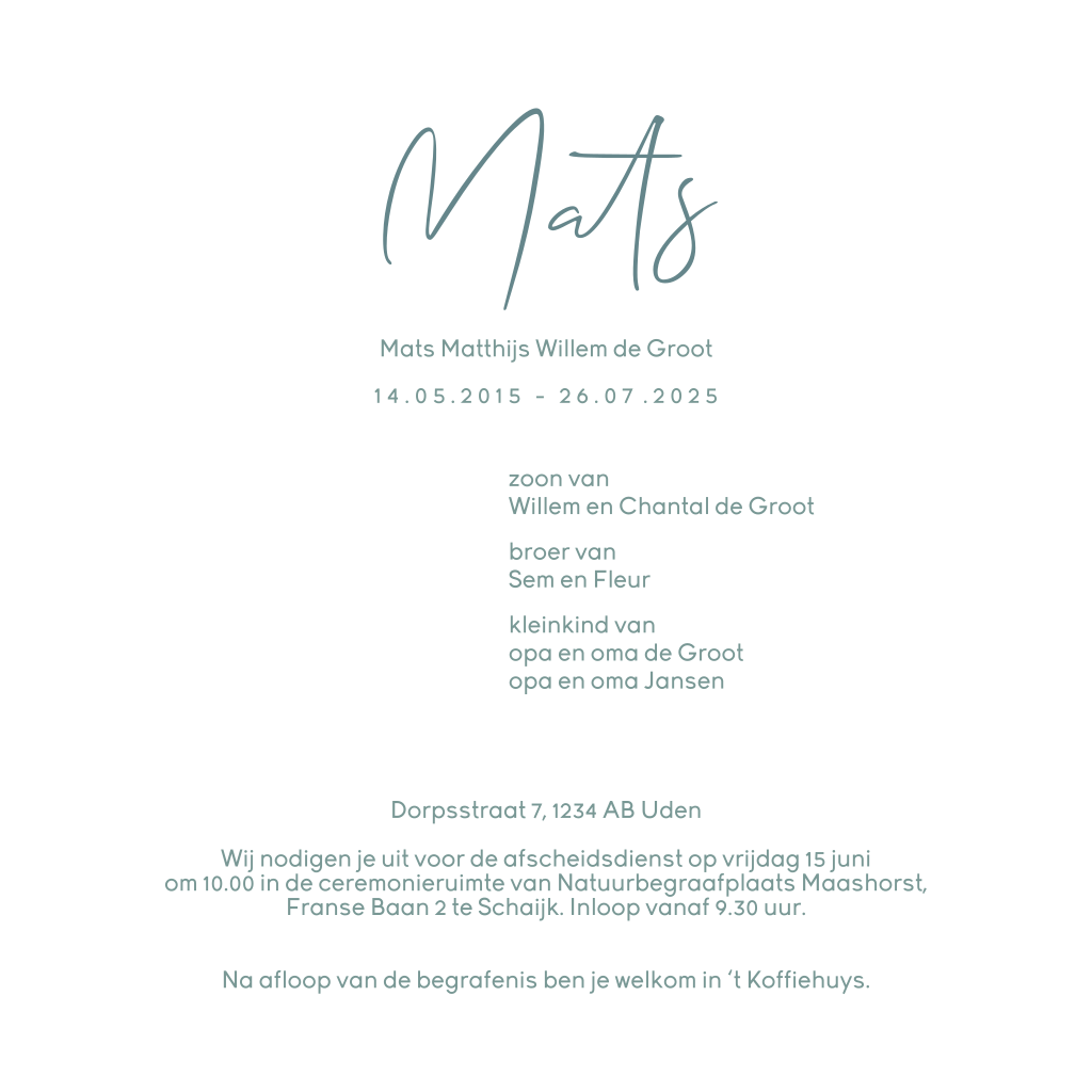 Maak met een favoriete kleur de rouwkaart in stijl met de foto.
