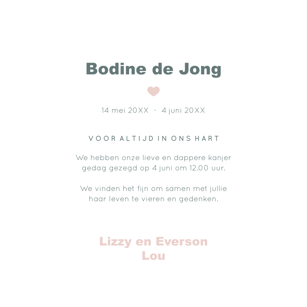 Prachtige stoere rouwkaart voor je dappere dochter. Mooie tinten in groen en strakke typografie. Maak een blijvende herinnering.