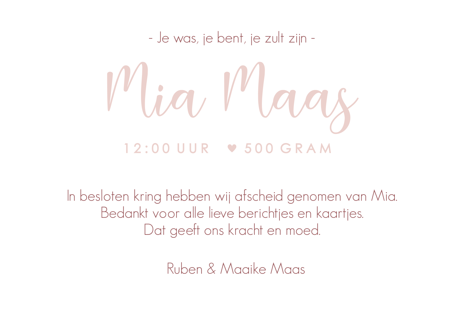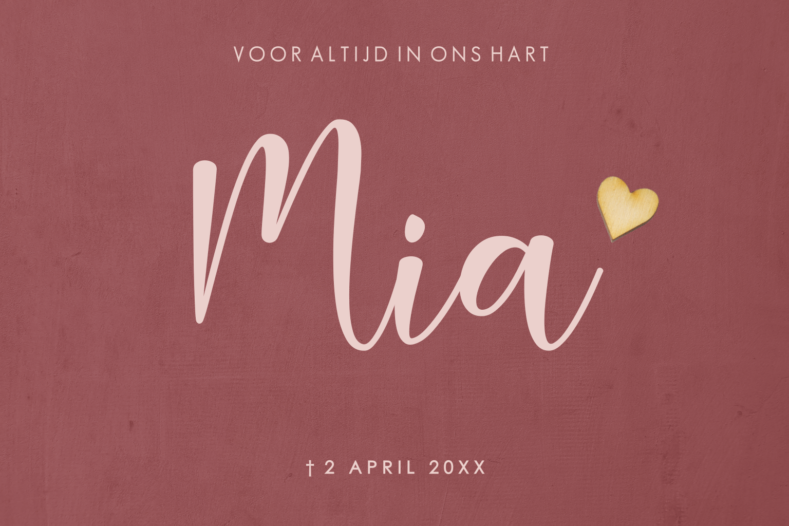 Voor altijd een speciaal plekje in jullie hart. Maak online een prachtig rouwkaartje om jullie dochter te herinneren. Op dit kaartje is een prachtig houten haartje toegevoegd.