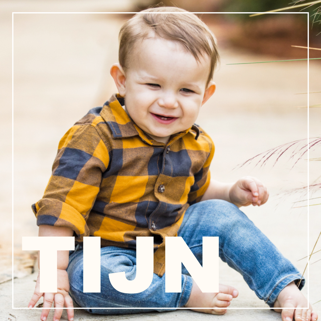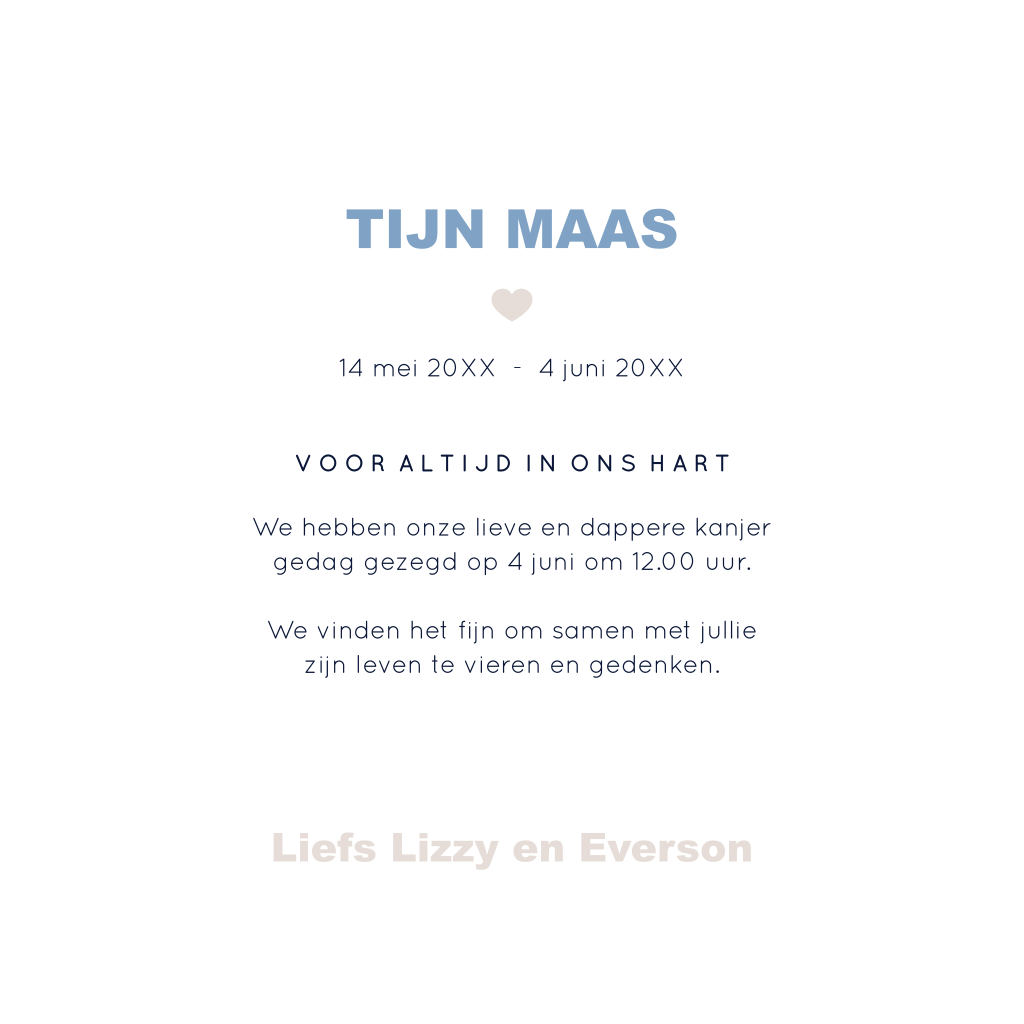 Maak een mooie rouwkaart voor je kind om familie en vrienden uit te nodigen voor het afscheid. Met foto en moderne typografie in mooie kleuren.