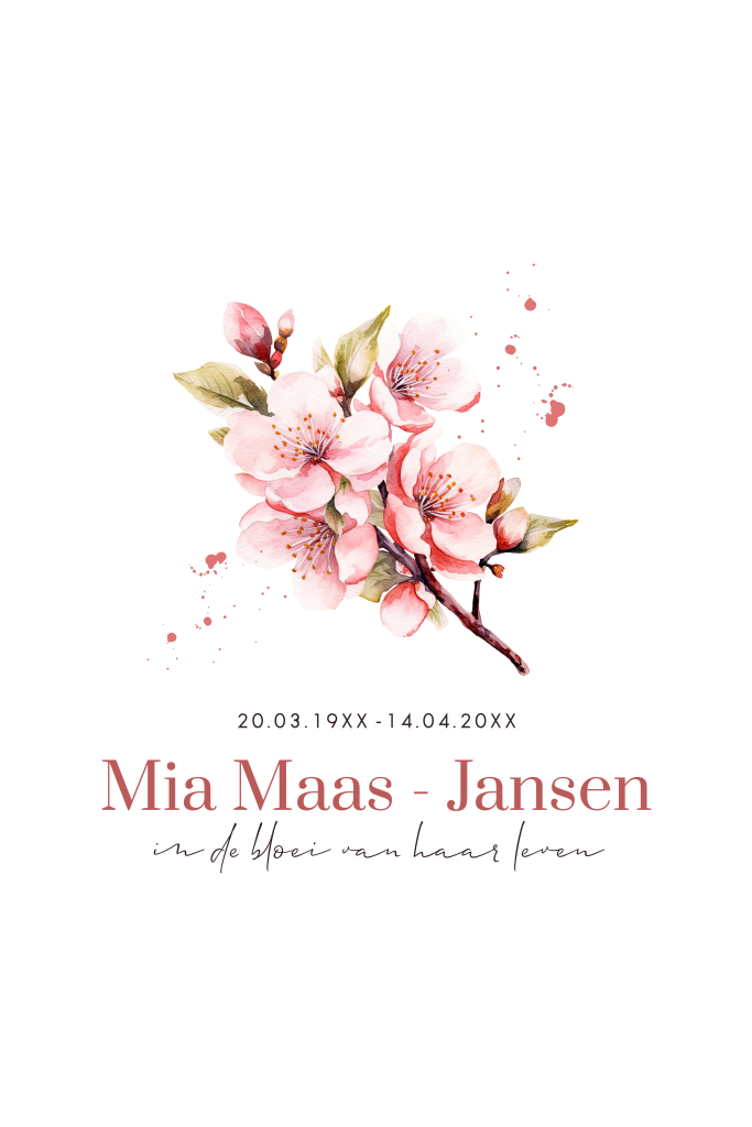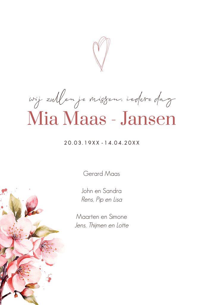 Kies voor deze rouwkaart met geïllustreerde bloesem in roze tinten. Bewerk de kaart eenvoudig in de editor en maak de kaart uniek voor jouw dierbare.