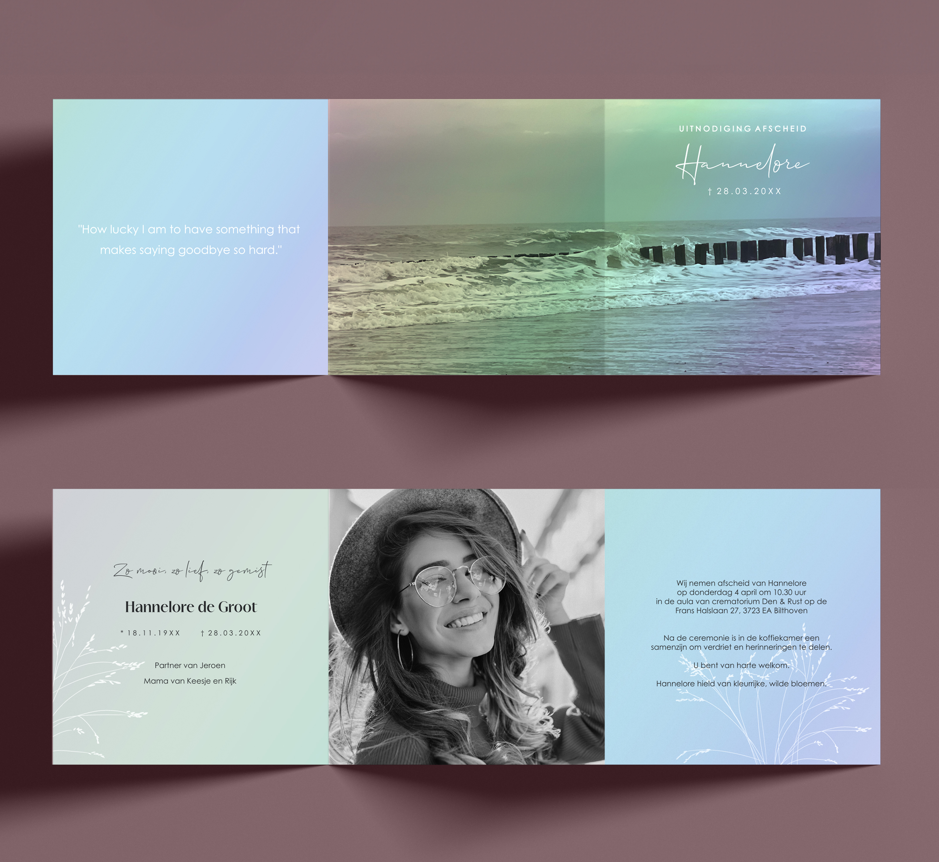 Drieluik rouwkaart met moderne uitstraling en zachte tinten