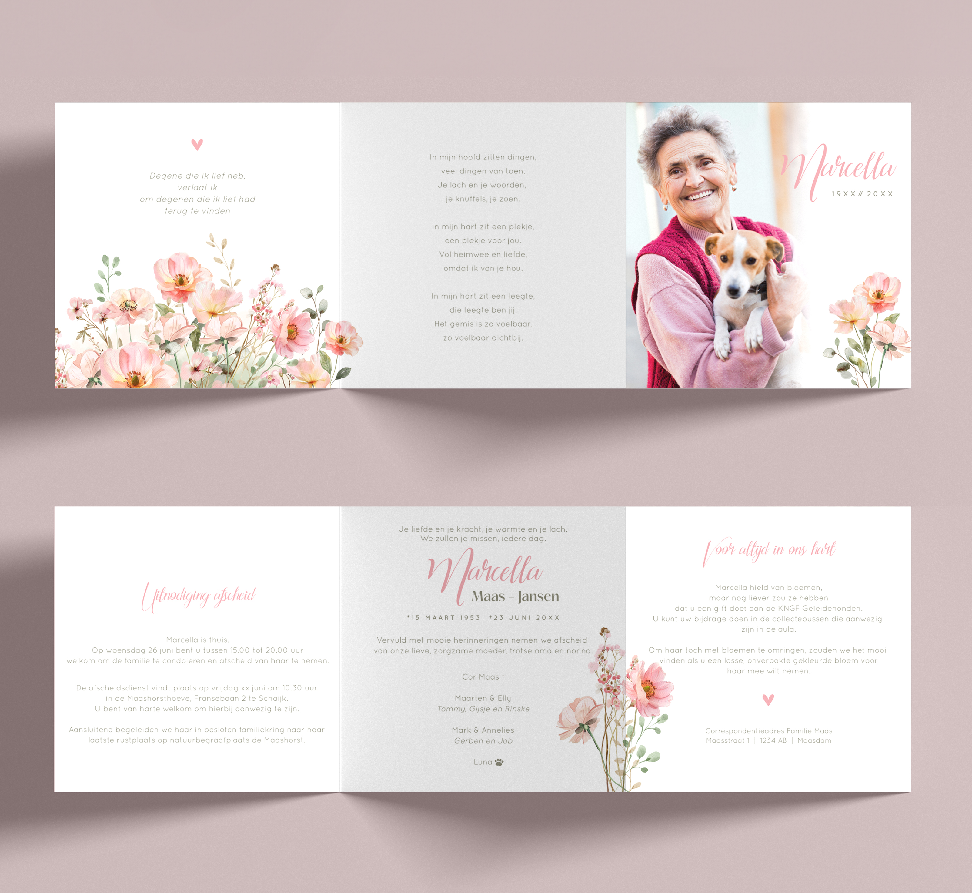 Unieke drieluik rouwkaart met zachte bloemen in pasteltinten en ruimte voor een persoonlijke foto. Stijlvol en liefdevol afscheid.