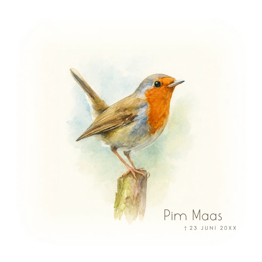 Symbolische rouwkaart met roodborstje in aquarel. Een dierbare keuze voor een warm en liefdevol afscheid, eenvoudig te personaliseren met naam en datum.