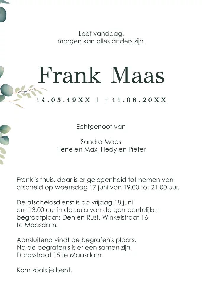 Deze serene rouwkaart met eucalyptus bladeren en subtiele kleuren biedt een ingetogen en liefdevolle manier om een dierbare te herdenken. Een stijlvol en rustig ontwerp dat past bij een waardig afscheid.