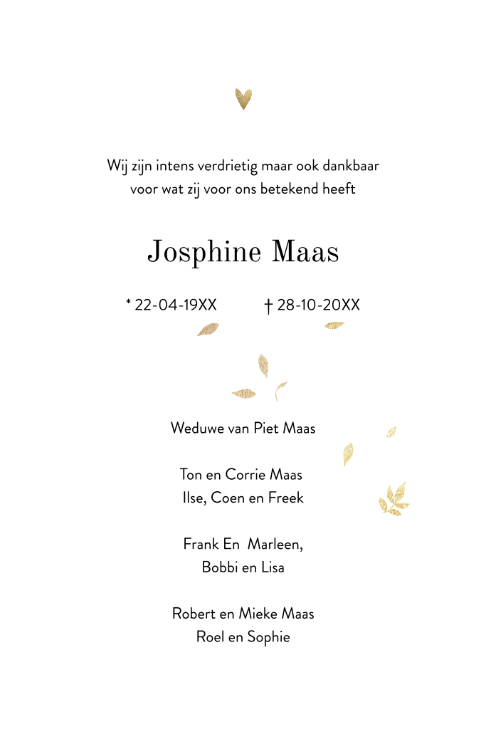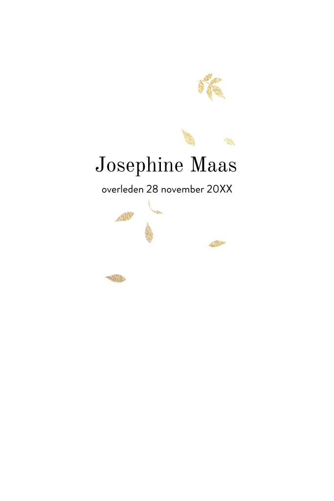 Rouwkaart clean met subtiele goudkleurige bladeren. Een afscheid van een geliefde is een belangrijk levensmoment. Daarbij hoort een passende rouwkaart. Bestel een proefdruk en ontvang daarbij onze papiersoorten en envelopkleuren.