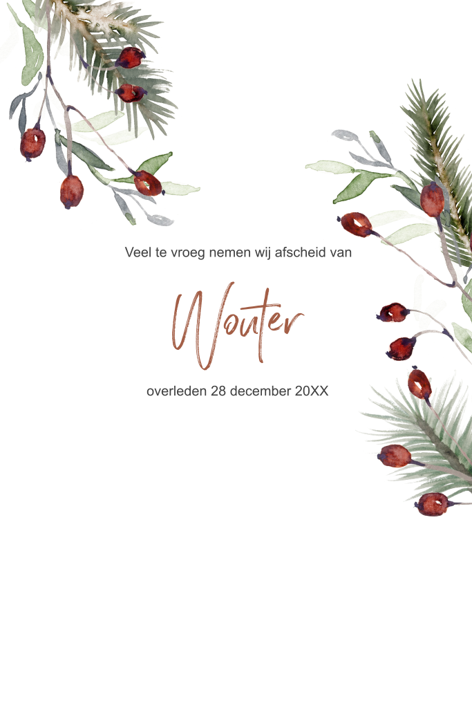 Een mooie rouwkaart in het thema winter. De illustraties van de besjes en dennen verwijzen naar de winter.