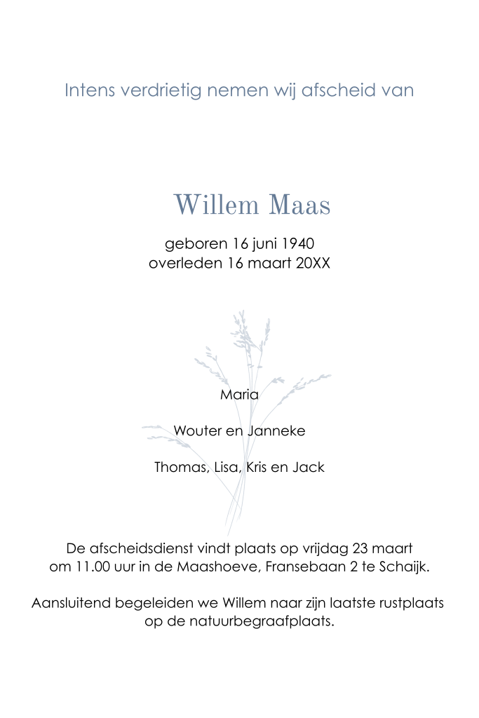 Rouwkaart met rustgevend landschap en persoonlijke Engelse tekst"