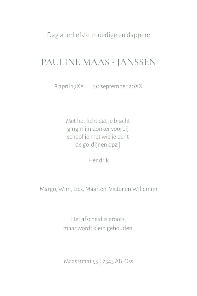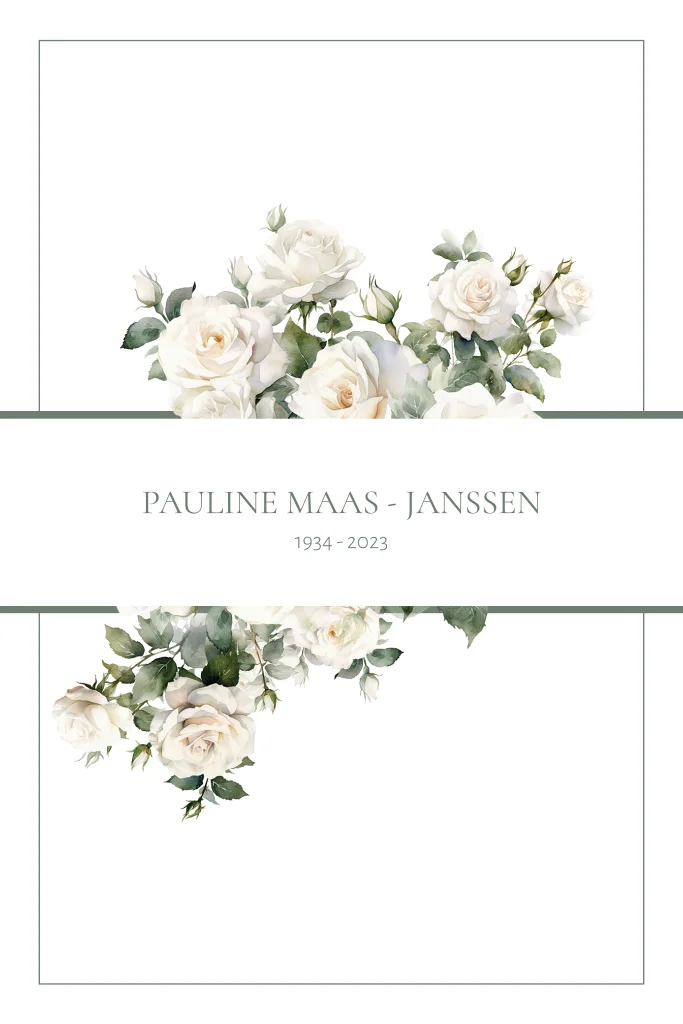 Maak een stijlvolle en lieve rouwkaart voor je dierbare. Deze rouwkaart met klassieke rozen in wit is een prachtige herinnering aan je dierbare.
