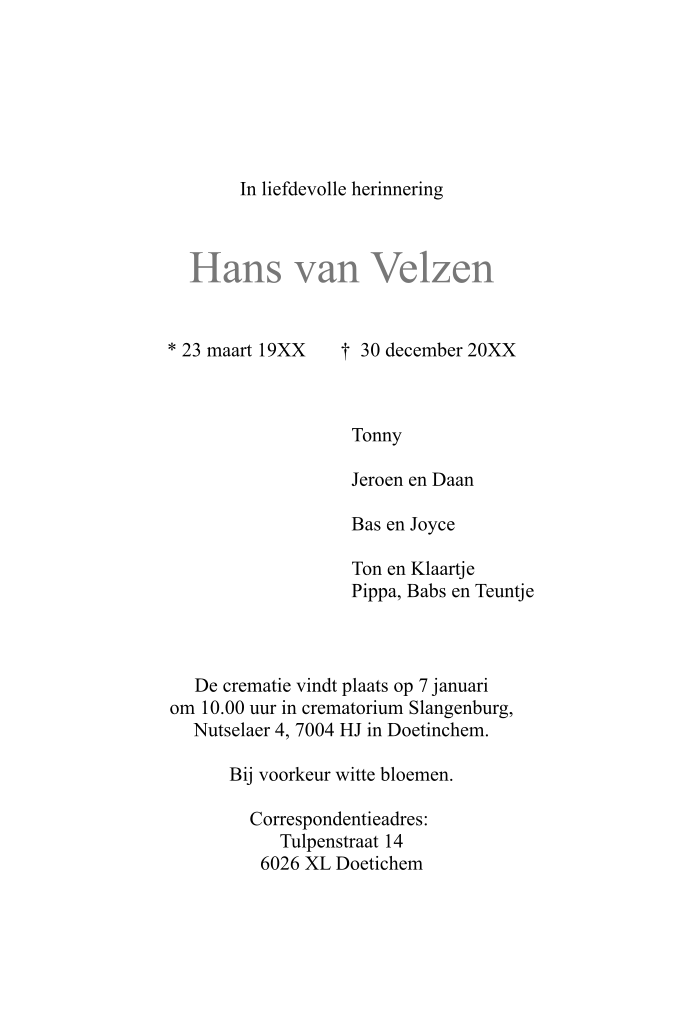 Klassieke rouwkaart met vogels en klassiek lettertype, met rouwrand.