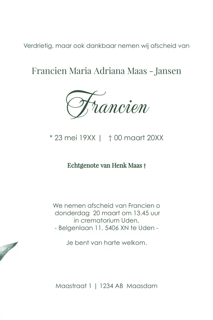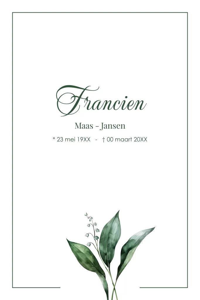 Kies voor een klassieke rouwkaart met dit lieve lelietje van dalen. Maak de uitnodiging voor het afscheid uniek met een persoonlijk gedicht.