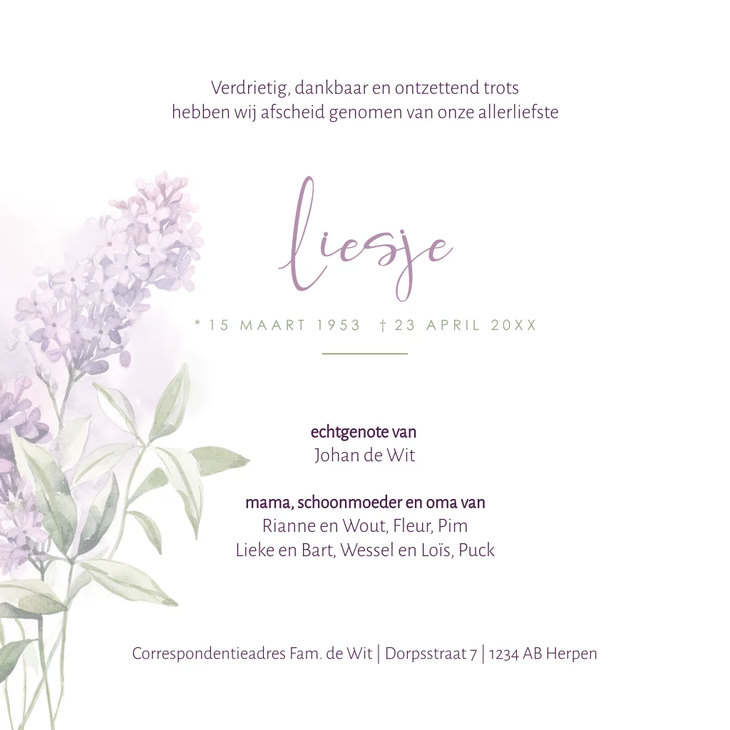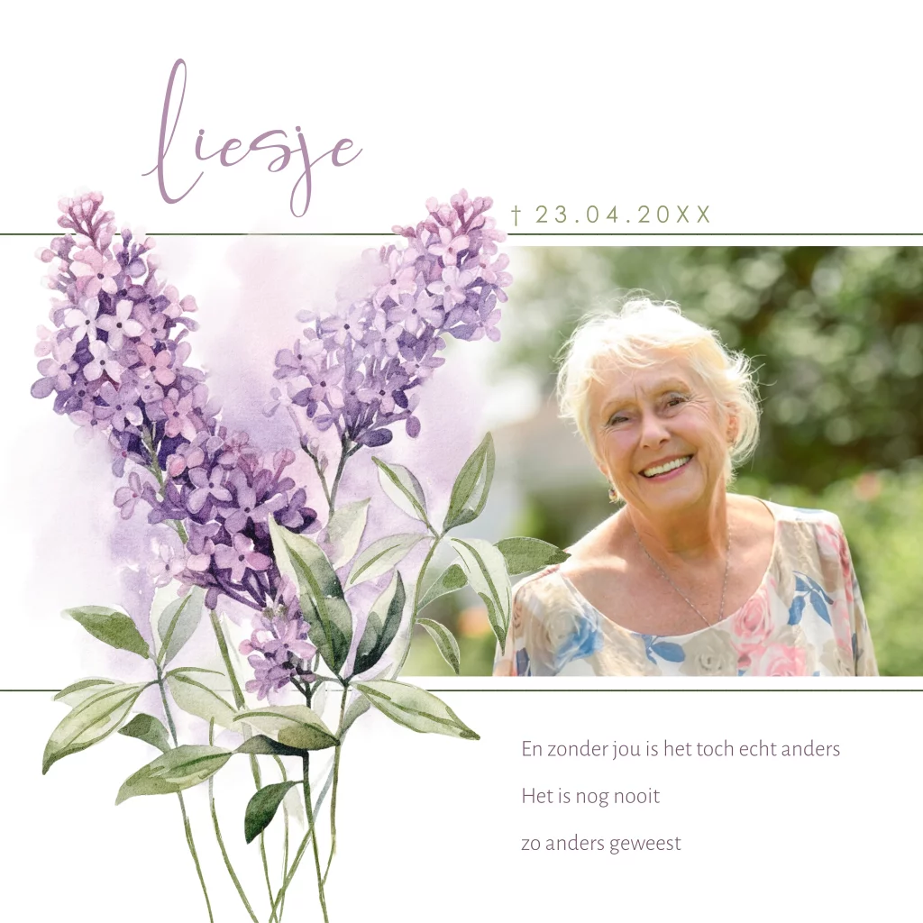 Een zachte rouwkaart met paarse seringen en foto, voor een warm en liefdevol afscheid van een dierbare vrouw.