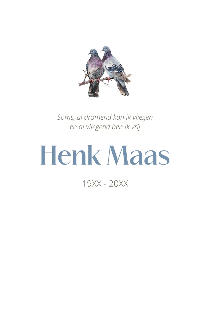 Een rustige rouwkaart met gedicht en vliegende duif, als troostrijke symboliek van loslaten en eeuwige vrijheid.