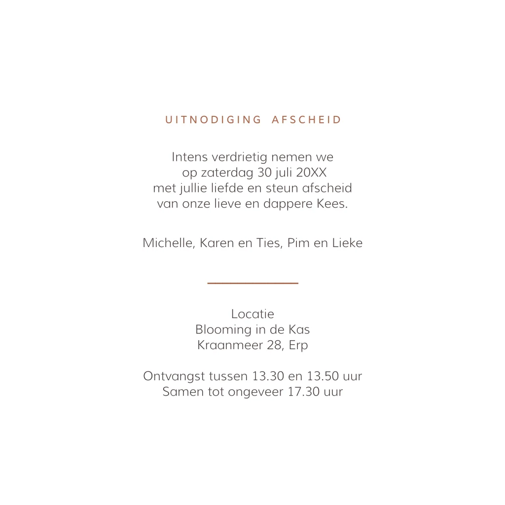 Een uitnodiging voor het afscheid, vormgegeven met een persoonlijke foto. De tinten uit de foto vormen de basis van het ontwerp, zodat beeld en kaart samen één rustig en liefdevol geheel worden.