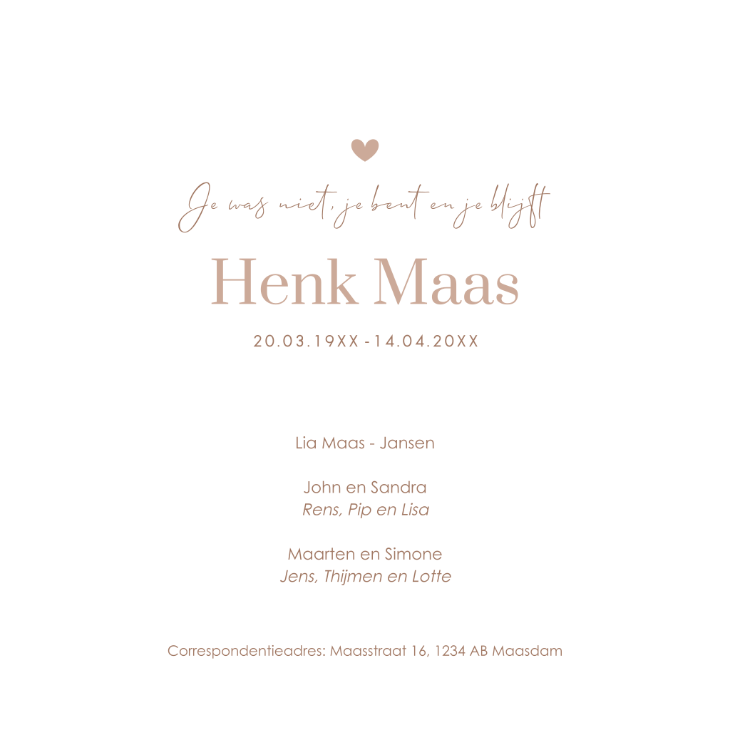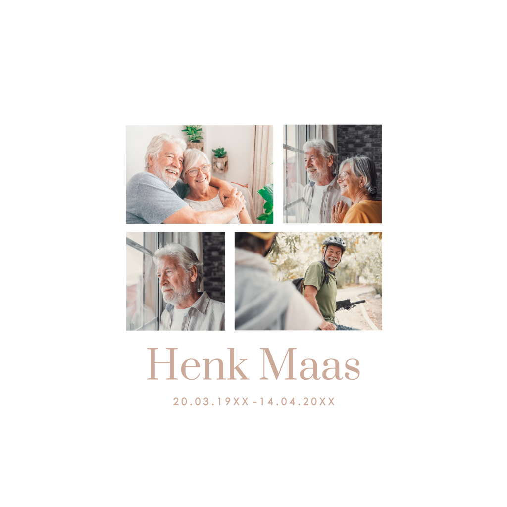 Persoonlijke foto's op de voorzijde van de rouwkaart in een mooie collage. De kaart vertelt over het leven van je dierbare.