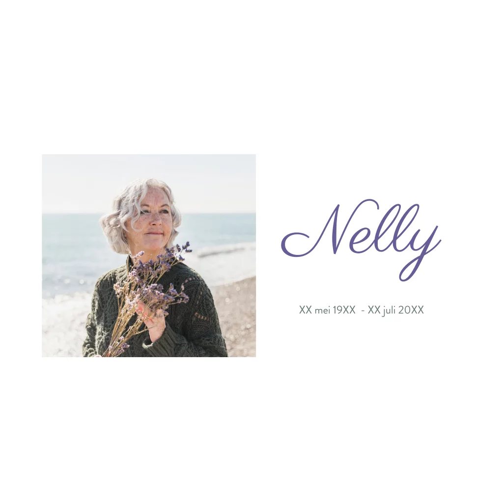 Rouwkaart met foto en bloemen in zachte pasteltinten. Personaliseer deze kaart voor een liefdevol en stijlvol afscheid van een dierbare.