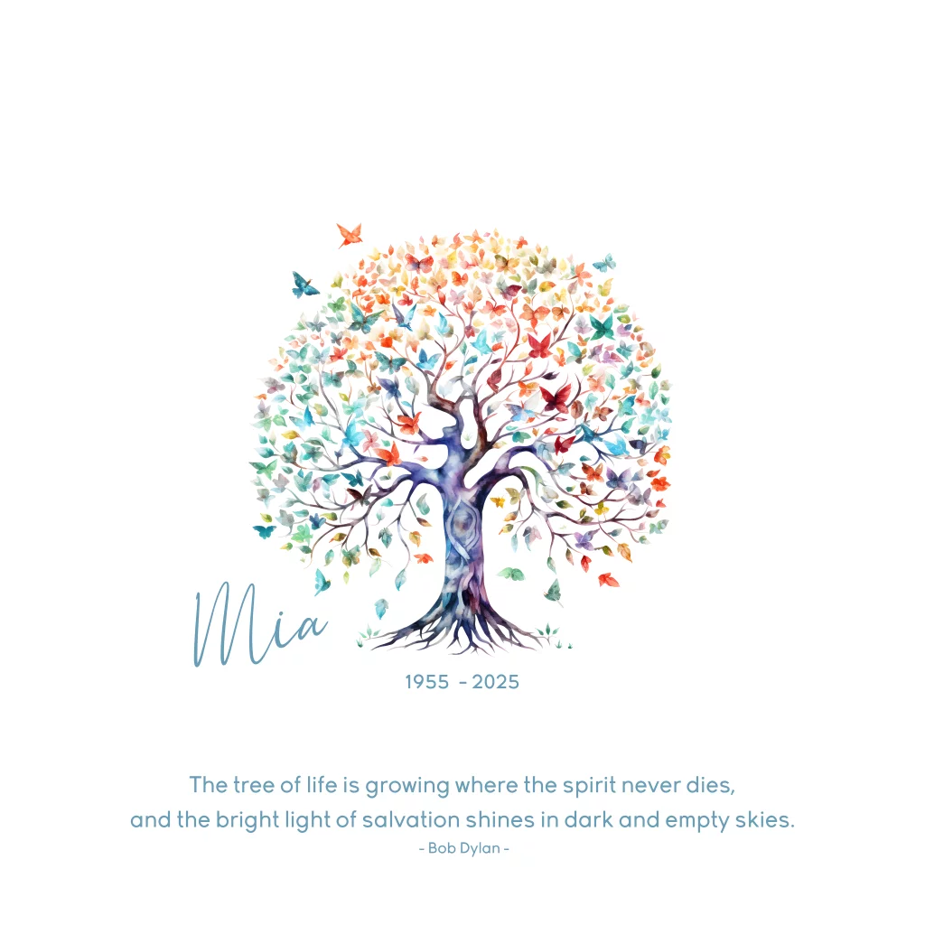 Prachtige rouwkaart met kleurrijke levensboom en vlinders