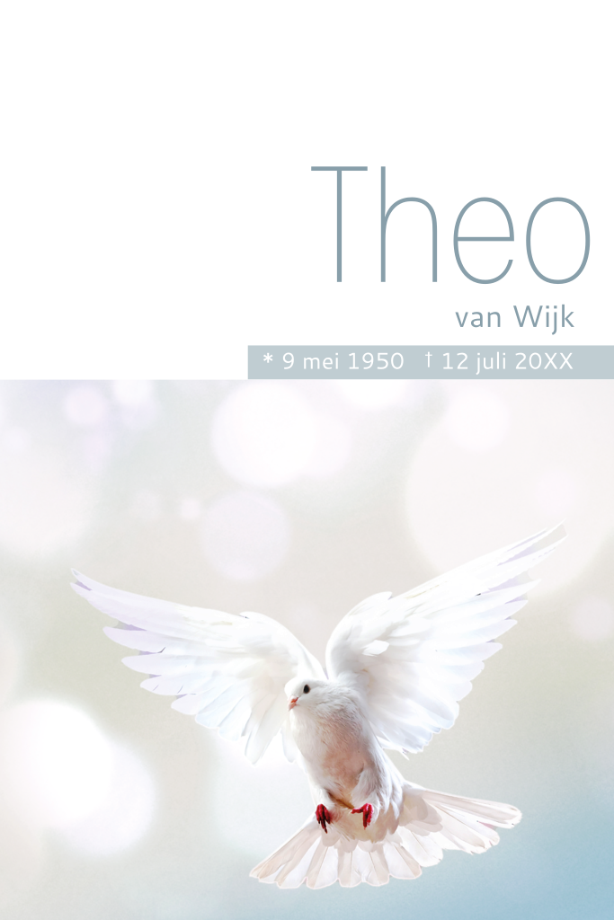 Moderne rouwbrief met foto van duif en ruimte voor naam